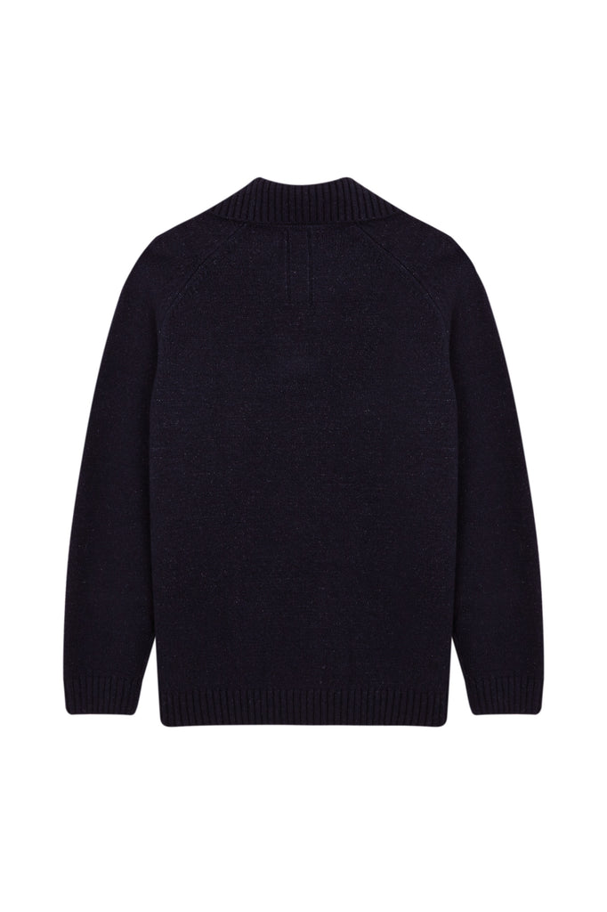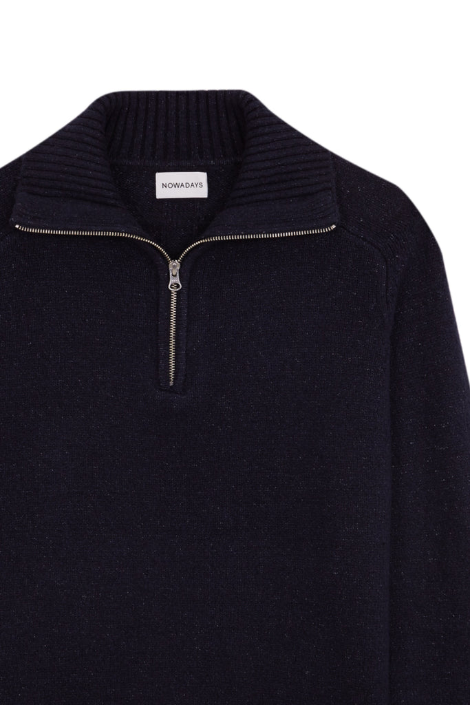 This sweater is made from a boucle cotton knit with a very soft and cozy handfeel. Designed for a regular fit, it has raglan sleeves, high collar with zipped closure and ribs at hem and cuff