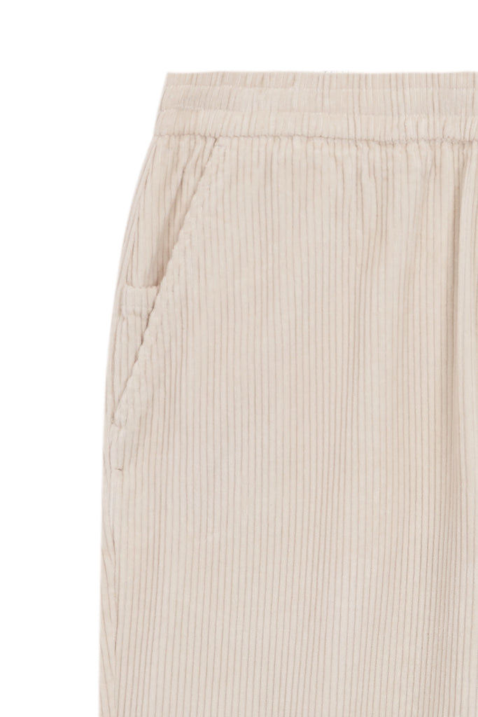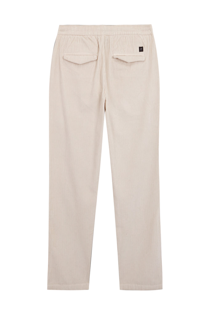 This modern easy pants is made from coarse corduroy. Designed for a modern fit, it has an elastic waistband for great comfort and a contemporary look. Come with side pockets in front and two piped flap pockets on back.